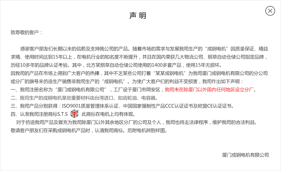 公告信息:   因我司的產(chǎn)品在市場(chǎng)上得到廣大客戶的熱捧,其中不乏某些公司打著“某某成鋼電機(jī)”為我司廈門成鋼電機(jī)有限公司的分公司或分廠的旗號(hào)來(lái)仿造生產(chǎn)銷售非我司生產(chǎn)的“成鋼電機(jī)”。為使廣大客戶們的利益不受損害,我司作出如下聲明: 一、我司注冊(cè)名稱為“廈門成鋼電機(jī)有限公司”,工廠設(shè)于廈門市同安區(qū),我司未在除廈門以外國(guó)內(nèi)任何地區(qū)設(shè)立分廠。 二、我司生產(chǎn)的成鋼電機(jī)采用的齒輪、電容器、潤(rùn)滑油等均為臺(tái)灣進(jìn)口,并可提供海關(guān)報(bào)關(guān)單。 三、我司產(chǎn)品分別獲得:ISO9001質(zhì)量管理體系認(rèn)證、中國(guó)國(guó)家強(qiáng)制性產(chǎn)品CCC認(rèn)證證書(shū)及歐盟CE認(rèn)證證書(shū)。 四、認(rèn)準(zhǔn)我司注冊(cè)商標(biāo)S.T.S ???此商標(biāo)在電機(jī)上均有體現(xiàn)。 ????對(duì)于仿造我司產(chǎn)品及冒充為我司除廈門以外其余地區(qū)分廠的公司及個(gè)人,我司也將走法律程序,維護(hù)我司的合法利益。 敬請(qǐng)客戶朋友們?cè)诓少?gòu)成鋼電機(jī)產(chǎn)品時(shí),認(rèn)清我司商標(biāo)。后附電機(jī)辨別樣圖。
